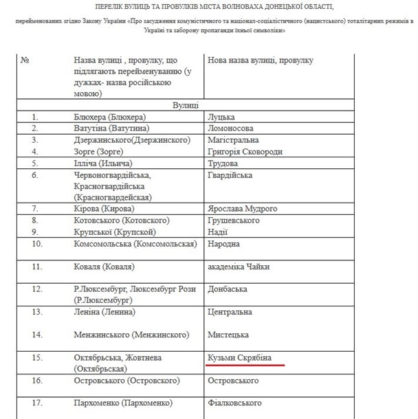 Таке рішення ухвалила Волноваська міська рада 16 жовтня. Раніше ця вулиця називалася Жовтнева. Рішення про її перейменування було прийнято відповідно до закону «Про засудження комуністичного і націонал-соціалістичного (нацистського) тоталітарних режимів в Україні та заборону пропаганди їх символіки».
